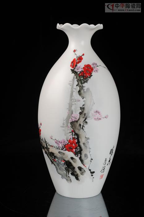 作品胎体采用德化上等玉瓷制成,瓷泥一吨达数万元,瓷质温润,细腻。作品画工精致,所绘梅花干苍枝劲,花朵疏落有致,格调清新,颇具意境。瓶体圆润光滑,口部形似荷叶,瓶身线条流畅,显得丰满俊秀。以梅开五福入画,色泽温润柔美,具有典雅秀丽的艺术风格。