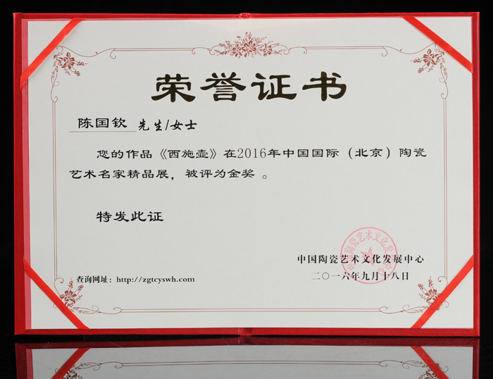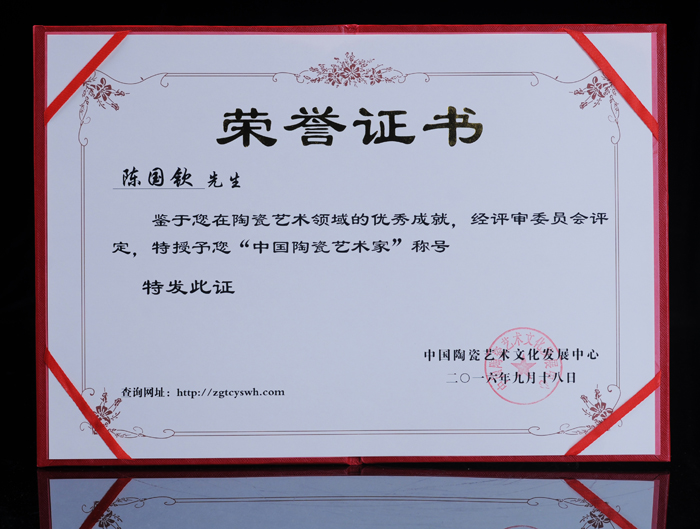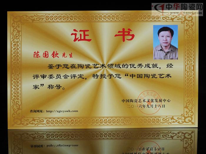 2016年9月,鉴于陈国钦在我国陶瓷艺术领域取得的突出成就,经中国陶瓷艺术文化发展中心评审委员会评定授予陈国钦“中国陶瓷艺术家”称号。