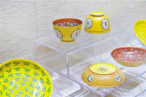 展览现场,有一套馆藏“镇馆之宝”——同治皇帝大婚瓷。记者看到,这套同治大婚瓷共分碗、盘、碟、酒盅、羹匙等24种器形,淡黄的色底上配有蓝、绿、粉色的纹饰,其烧造工艺十分考究。每件瓷器的款识一律用红彩楷体书写,有“同治年制”和“燕禧同和”两种款式。