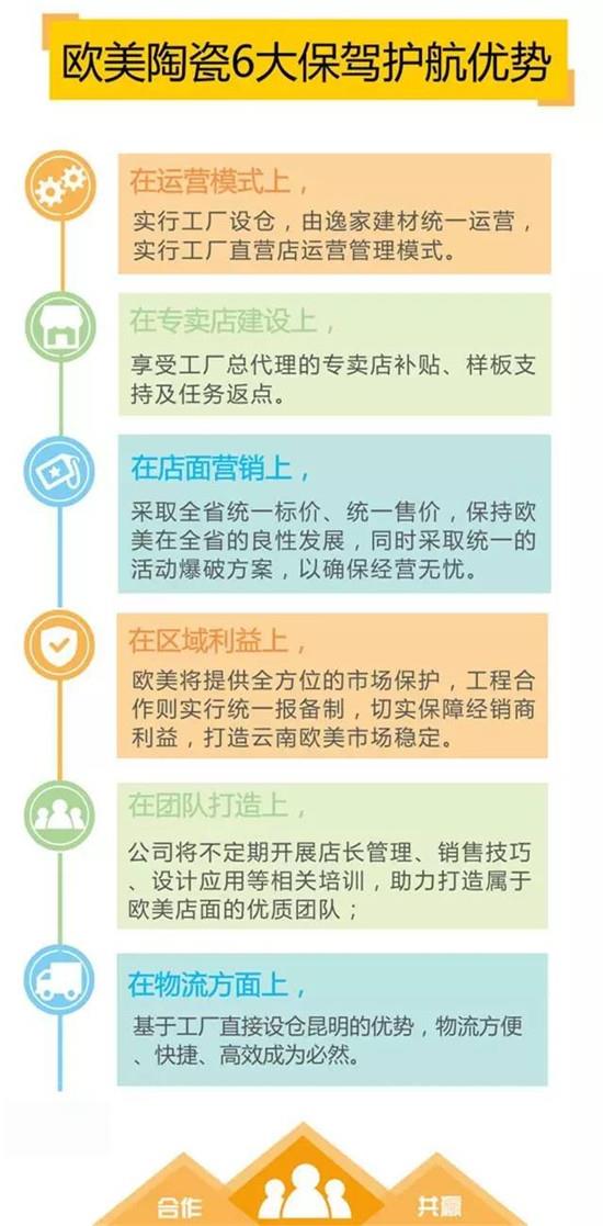 欧美陶瓷云南分公司为了能更好地开拓云南当地的市场,将于2016年11月8日召开“新模式 新平台 新未来”主题招商会暨昆明营销中心开业仪式。在11月8日举办的云南地区招商会上,欧美陶瓷也会给予经销商们非常利好的政策,同时,成为欧美陶瓷云南分公司的经销商,将享有平台保驾、政策护航的明显优势。