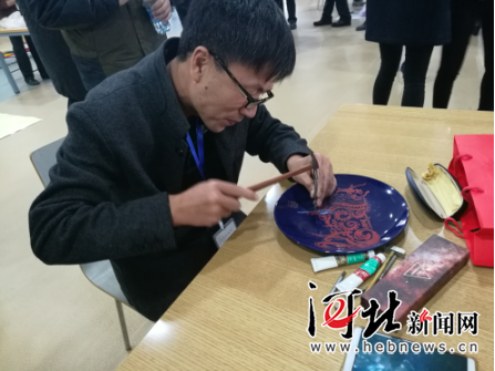 11月15日,河北省“唐工院杯”陶瓷艺术优秀作品展暨陶瓷技艺大赛开幕,图为现场刻瓷展示。
