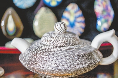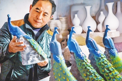 11月23日,焦作市国宝绞胎瓷艺术工作室,一只只孔雀蓄力欲飞。绞胎瓷,因其花纹表里如一、不可复制而被誉为陶瓷中的“珍奇”;胶釉瓷,因其纹花纹饰色彩艳丽动人而被赞誉为陶瓷中的“奇葩”。胶釉瓷制作技艺传承人董国保把胶釉瓷的造型、花纹、纹理融于绞胎瓷的生产工艺中,创作出了100多个品种的作品,产品远销欧美等国家和地区。