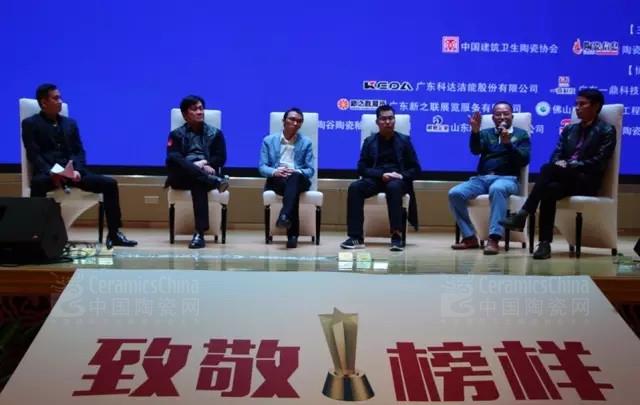 兴辉集团董事总经理柯显仁、新中源陶瓷有限公司常务副总经理陈勤显、宏宇陶瓷品牌销售常务副总经理张念超、资深营销人赖成东、费罗娜陶瓷有限公司总经理陈高照,对话论道。