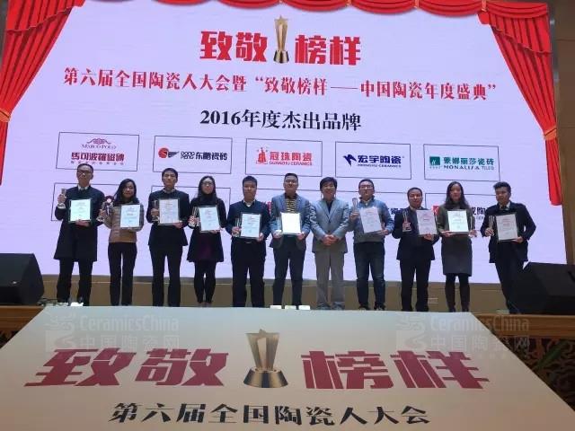 2016年度杰出品牌:马可波罗瓷砖、东鹏瓷砖、冠珠陶瓷、宏宇陶瓷、蒙娜丽莎、金意陶瓷砖、欧神诺陶瓷、新中源陶瓷、简一大理石瓷砖、新润成陶瓷