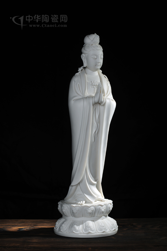 简介:陈廷实代表作品之一,观音头髻发束,面容慈祥,宽袖衣裙、双手合十立于莲座之上为众生祈福,作品胎质致密洁白,雕塑精细,观音衣褶裙带线条流畅、洗练,形象栩栩如生。手刻签名,具有较高的收藏价值。