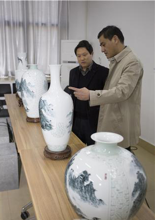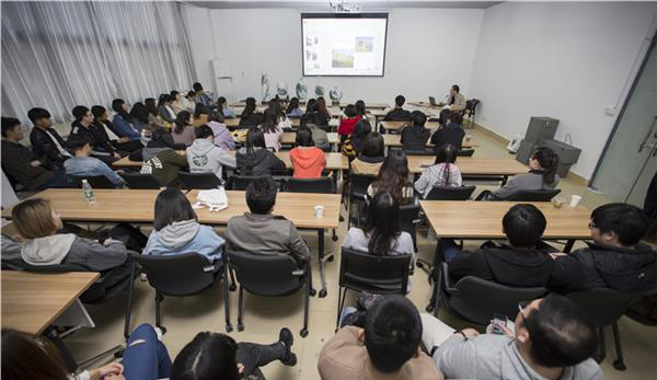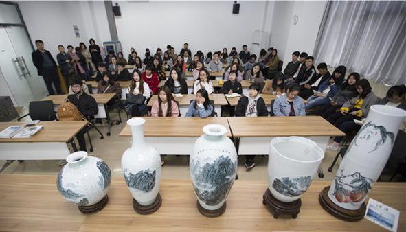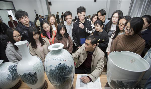 2017年3月27日,在南京林业大学艺术设计学院,画家刘越胜为大学生们讲述画青花的体会。当日,南京林业大学艺术设计学院举办学术讲座,首次邀请画家为大学生们讲述画青花的体会,让大学生们近距离了解“瓷以画传,画以瓷传”的无穷魅力。
