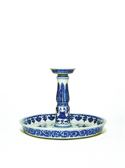 这件清乾隆早期“唐英自用青花缠枝花卉纹烛台”,仅剩烛台的上半部分,其底部蜡盘宽厚,口沿外撇,通过极富韵律感、线条起伏多变的圆柱与灯盏托盘相连。蜡盘与灯盏托盘为分段烧造,拼接组装而成。烛台胎质细腻,釉汁晶莹,通体纹饰以青花绘就,自顶端灯盏托盘至底部蜡盘内外分绘回纹、蕉叶、双犄牡丹、折枝莲花、如意云头、卷草朵花等多层纹饰,青花发色沉着,仿宣窑点染笔意浓重,颇具雍正遗风。纹饰的布局和折枝莲花的画法带有强烈的洛可可艺术风格,说明此时唐英本人在瓷器纹饰的设计上也已经充分接受了西洋艺术装饰手法。