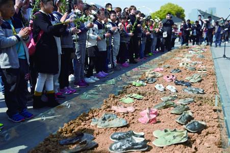 清明节,除了缅怀逝去的祖先和亲人,我们不应忘了在1937年那场战争中遇难的30万同胞。4月3日上午10时,侵华日军南京大屠杀遇难同胞纪念馆雕塑广场上,陈列着80双象征着被杀戮同胞的陶瓷鞋,用这种特殊的方式悼念在80年前那场惨案中遇难的同胞。