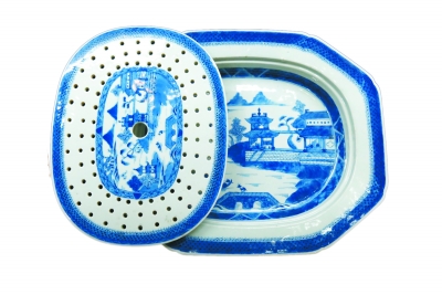 关海森为了研究这件器物的用途查阅了许多资料,在欧美一些著名的博物馆里也有相同的器物,但对其用途介绍较少。恰好有几位欧洲藏家来看展览,他们当场给出了一致的解释,这是欧洲贵族盛放烤火鸡、烤鹿等的容器,滚烫肉食上渗出的油脂可以通过瓷板上的小孔渗漏到下面的深盘里。关海森笑着说,面对面的交流有时要比钻到书本里查资料离答案更近。