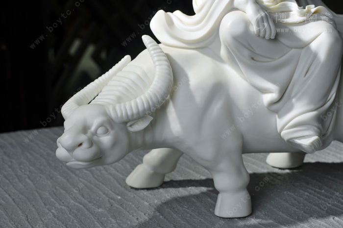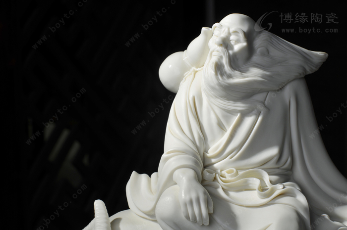 老子素衣布鞋,须眉皓如积雪,而头发披散,不着巾帻,有飘飘欲仙,不与世争的风神。他微微地欠着腰,半睁半闭着那双洞察天地古今的慧目,寂然凝虑、悄焉动容。