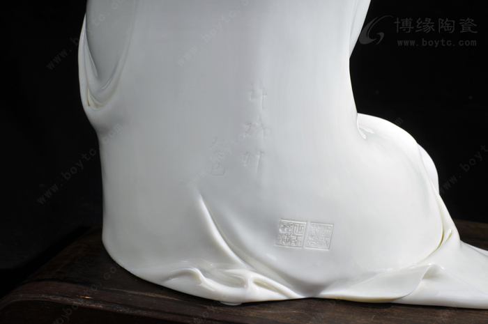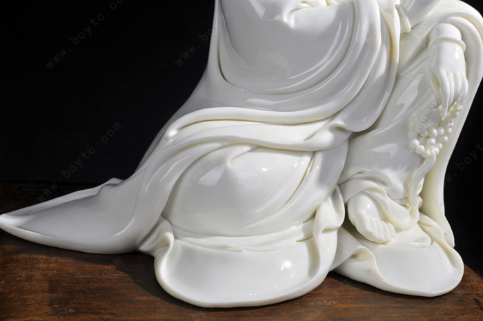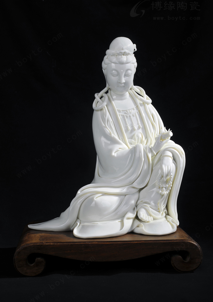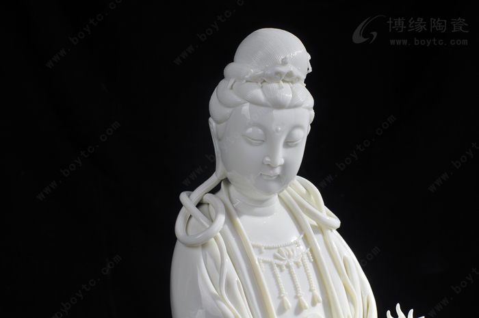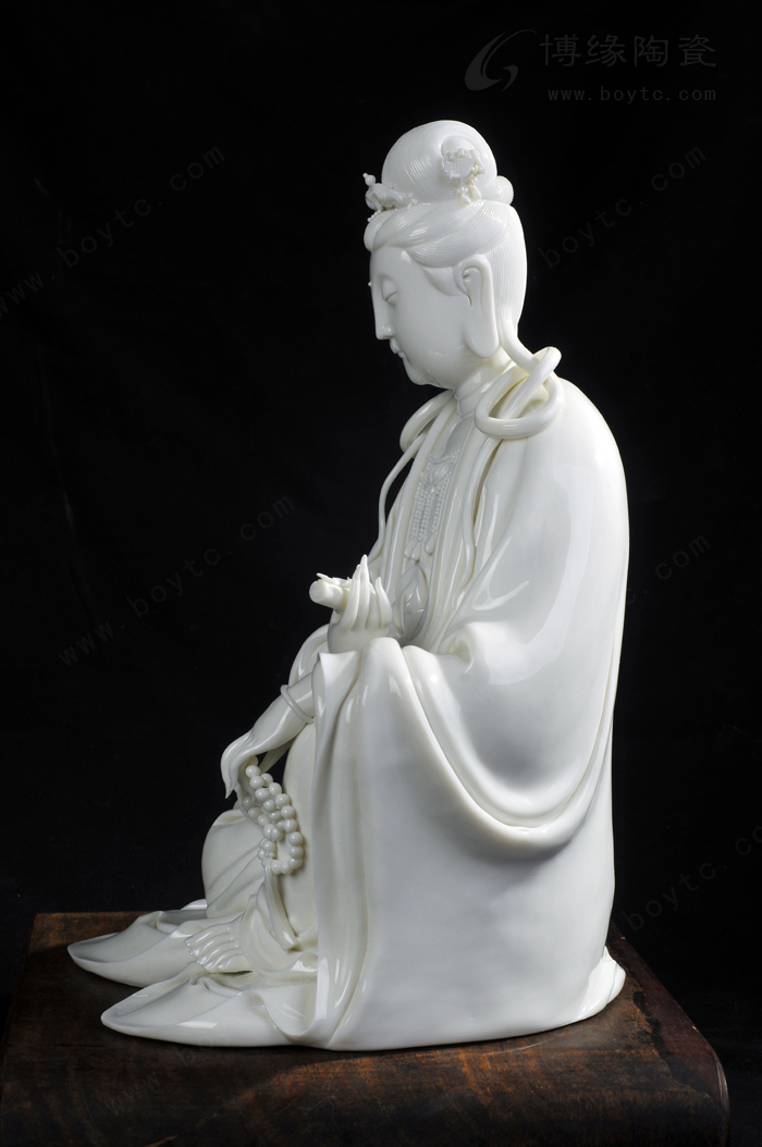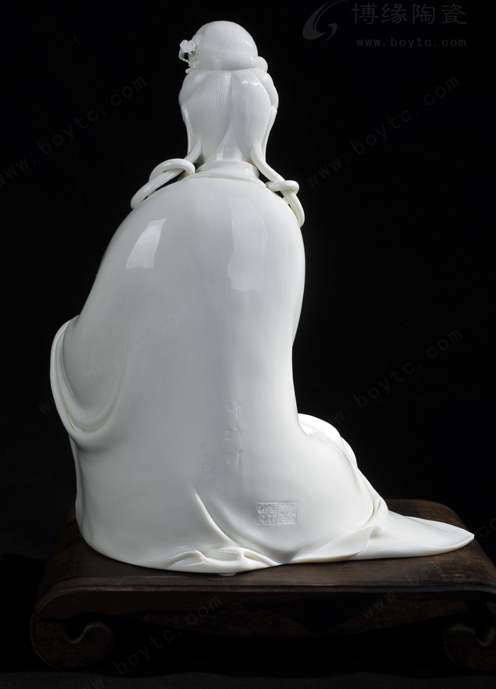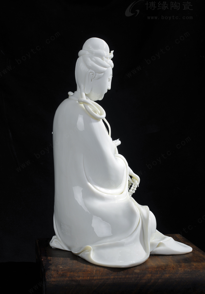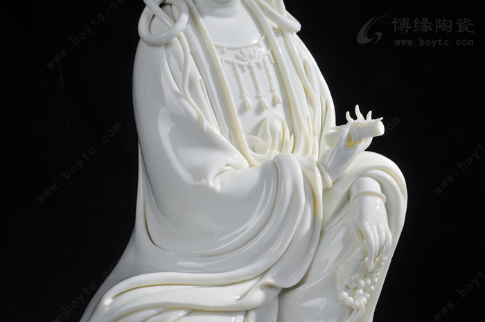 《持经观音》以德化特有的温润如玉的“中国白”为胎质,纯手工制作,所塑人物性格鲜明,造型优美,神态逼真,风格洗练。