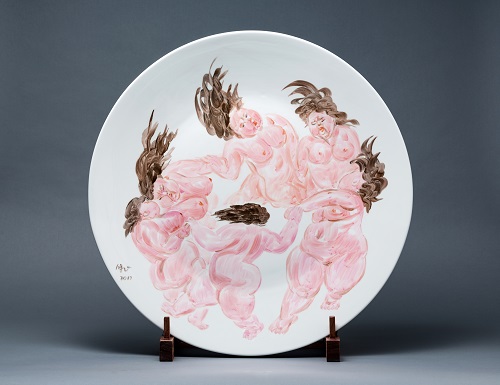 许鸿飞画瓷碟画源起于一位老朋友。这位老朋友是艺术鉴藏家,是收藏许鸿飞雕塑作品数量最多的一位艺术知音。他有敏锐的市场触觉,从许鸿飞的第一件胖女人雕塑开始就不断购藏许鸿飞的作品,当他感觉蜚声国际的许鸿飞雕塑作品的拍卖价格日益走高之时,便建议许鸿飞画碟子。2015年10月许鸿飞开始尝试绘制瓷碟画,第一批的100个瓷碟画也全被这位艺术知音收归囊中。曾经有人问许鸿飞像你有这样身价的一个雕塑家,为什么会跨界画瓷碟画?许鸿飞的回答是需要一种新的途径让更多人接触到我的作品。许鸿飞绘制瓷碟画也由起初对雕塑创作的一种调剂方式,逐渐成为非常投入的跨界创作,他上午做雕塑,下午以及傍晚的时间则留给瓷碟画。瓷碟画创作非但没有影响他的雕塑创作,在展现出学院派的扎实功底的同时,还重燃了心中的绘画激情,并在人物、动物造型等方面获得新的感悟。也许因为许鸿飞绘画呈现的独特性,更有藏家在购藏许鸿飞的雕塑作品的时候,会有意识地将许鸿飞的创作手稿到架上雕塑再到户外大型作品乃至延伸到瓷碟画实行系列购藏,以求该件作品的艺术体系的完整性与唯一性。许鸿飞丝毫没有避讳一个事实:每天都有收藏家来到他的工作室等待他的作品出炉,而收藏者的青睐是他创作的动力和获得回馈的激励。许鸿飞表示,假如我画了3个瓷碟画没有人反馈,我会考虑第4个是否停下来,想不到的是这样的尝试得到很多人的喜欢,有点无心插柳柳成荫的感觉,艺术有它的偶然性,一旦受到欣赏者的肯定,就有动力进行大胆的创作,所得到的进步和收获是意想不到的。