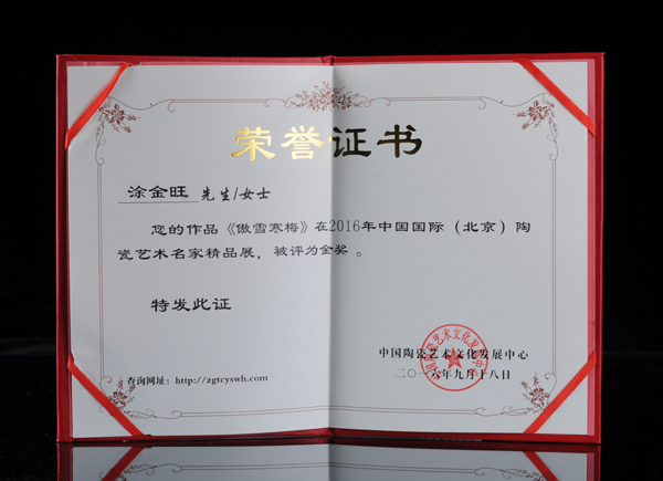 2016年作品《傲雪寒梅》在2016中国际(北京)陶瓷艺术名家精品展,被评为为金奖