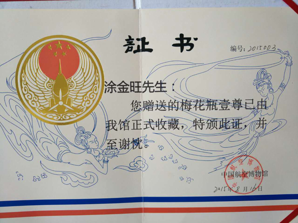 2015年8月,《盛世寒梅》被中国航空博物馆收藏,《铁骨冰魂》被北京和苑博物馆收藏,《傲骨寒梅》被北京明十三陵博物馆收藏;