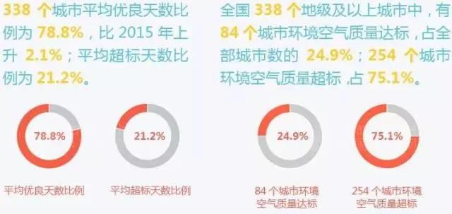 6月5日是世界环境日,这一天,中国环保部发布《2016中国环境状况公报》,公报指出:2016年,全国338个地级及以上城市中,有84个城市环境空气质量达标,占全部城市数的24.9%,254个城市环境空气质量超标,占75.1%,338个地级以上城市平均优良天数比例为78.8%,比2015年上升2.1个百分点。2591个县域中,生态环境质量为“优”“良”“一般”“较差”和“差”的县域分别有548个、1057个、702个、267个和17个。