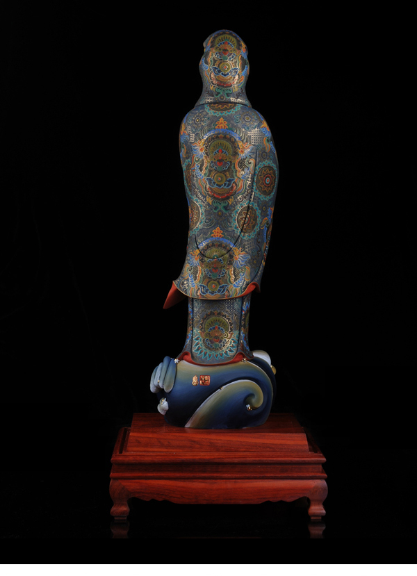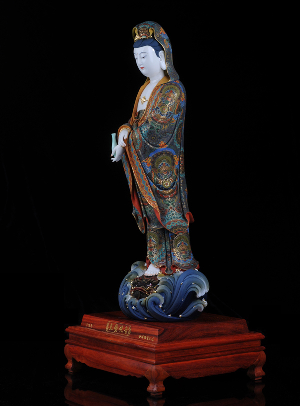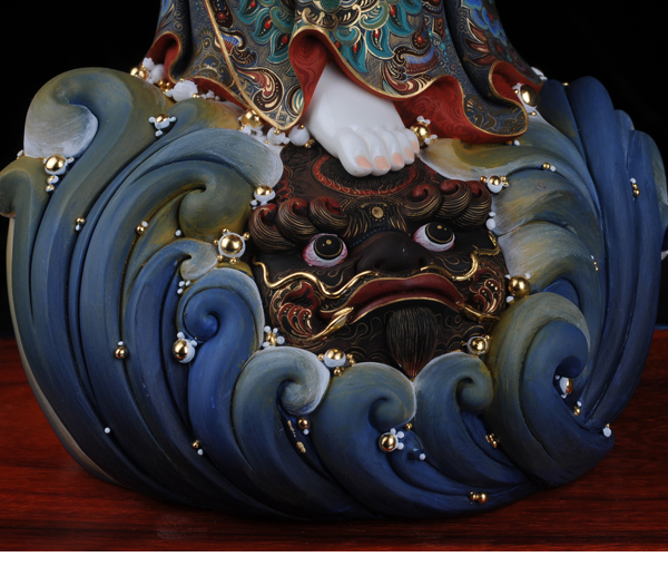 作品《立鳌观音》继承德化“何派”传统加以创新的雕刻手法,精雕细刻,把观音踏鳌巡海,漂浮于大海波涛之中,线条流畅,衣纹自然、飘逸,温润如玉,更展现其纯净、高雅的“东方女神”之魅力。