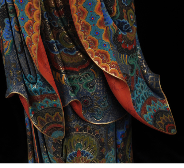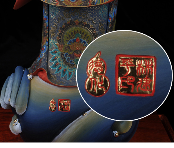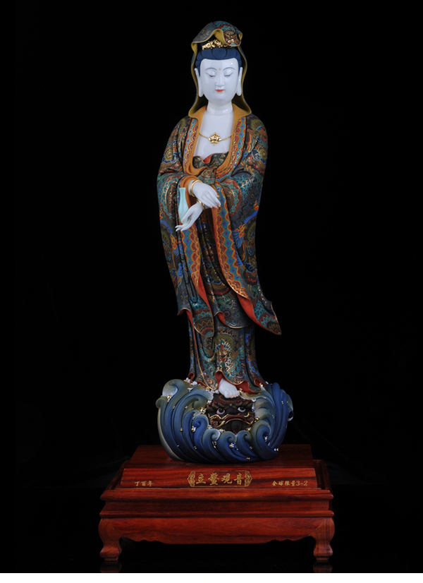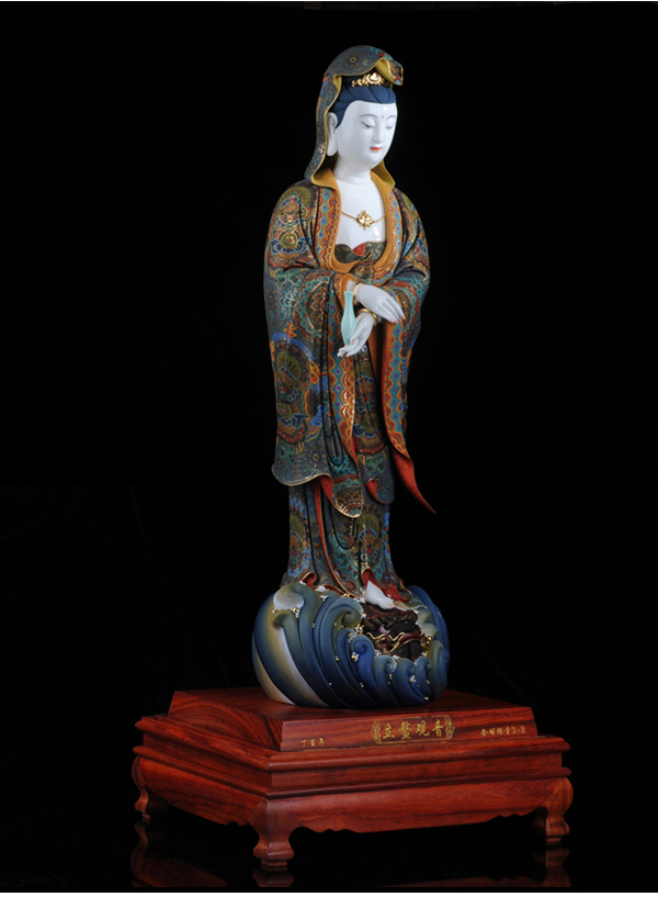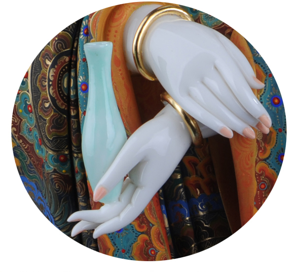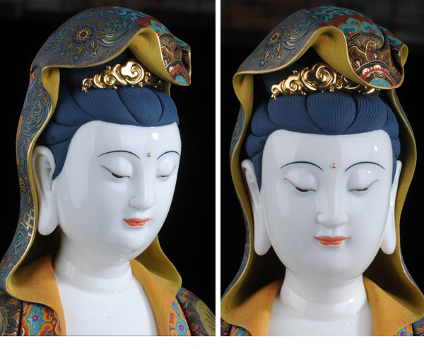 该作品彩用唐彩绘制,是德化白瓷与唐卡艺术相结合的突破,将天然矿物质与瓷塑完美结合,华丽高贵,用天然的朱砂、黄金等为原料磨成色釉全手工描绘而成,极大提升了陶瓷艺术品独特的艺术价值。历史上的彩绘,多是釉上彩或釉下彩,该作品将陶瓷的彩与唐卡的绘画工艺结合,避免了釉上彩和釉下彩的缺陷,使得作品既色彩鲜艳又完美和谐。此外,在进行彩绘时也细致入微,勾线、填色、线面效果无不体现出技术创新,创新并不仅仅局限于唐卡艺术与陶瓷艺术的结合,也表现在其意念上,比如,粗料与细料的色彩运用等。绘画难度过大“如同菩萨修行,要经得起重重考验和磨练方能成功”千年不褪色。