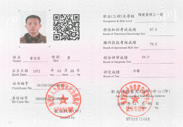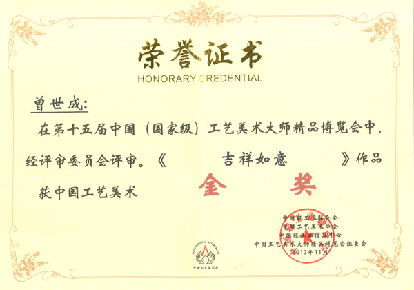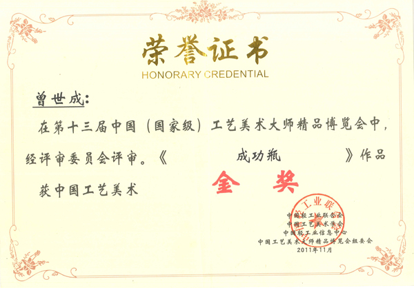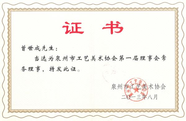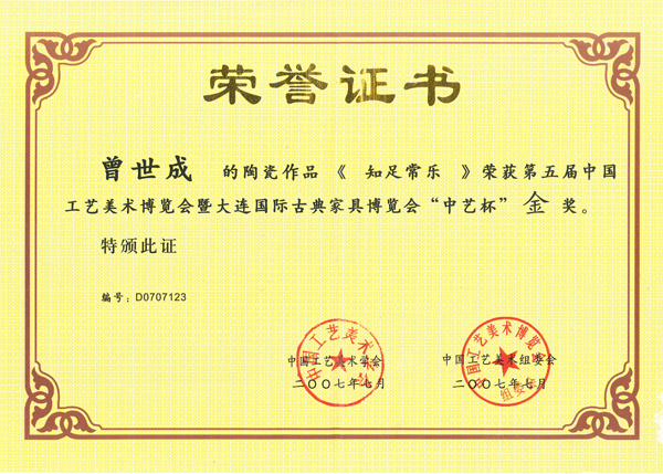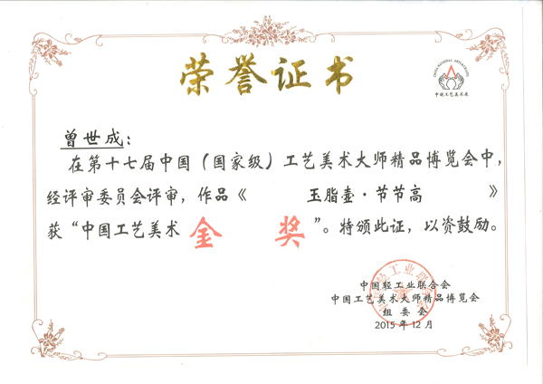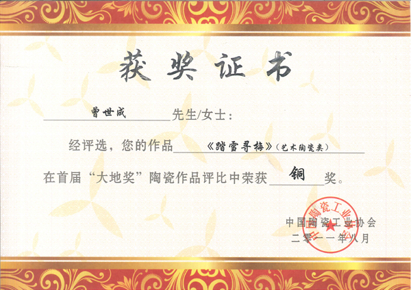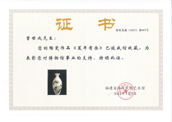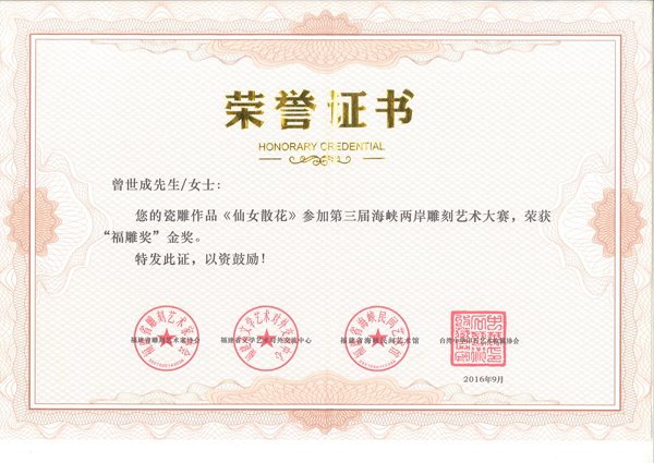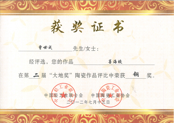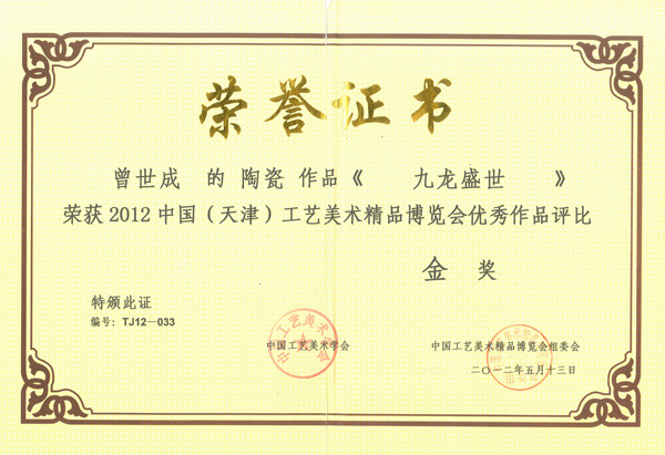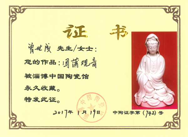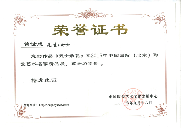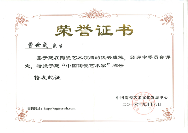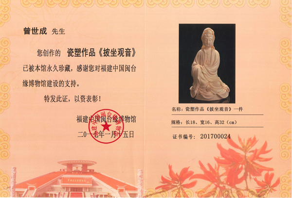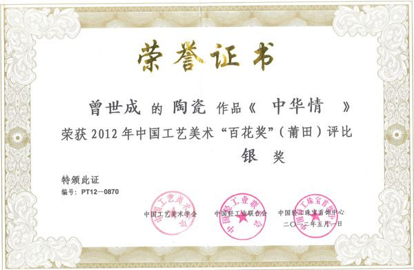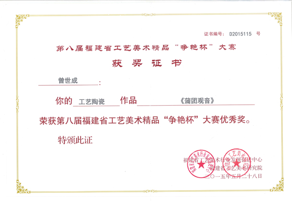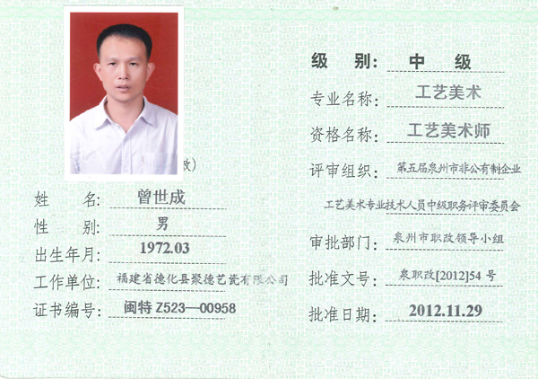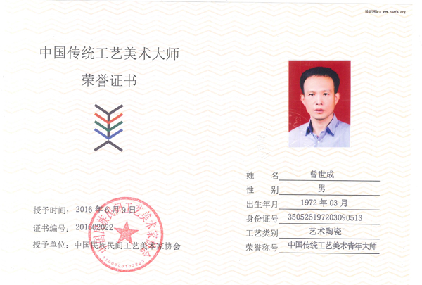 个人简介: 曾世成、男、汉族、祖籍福建省泉州市德化县,1972年出生于中国瓷都,德化一陶瓷世家,从小深受陶瓷文化的熏陶。毕业于景德镇陶瓷学院,中级工艺美术师,国家一级/高级技师、中国传统工艺美术青年大师、中国陶瓷艺术家称号,2006年在北京“中国工艺美术学会高级研修班”进修。其作品屡屡荣获各种奖项及被多家博物馆收藏。