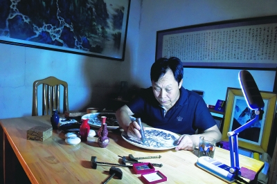 刻瓷是“以刀代笔”在瓷盘上进行创作。