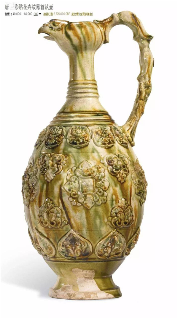最近两年拍卖市场上出现过一件明星级别的凤首壶。2015年5月伦敦苏富比春拍,一件将近37厘米高的三彩贴花卉纹凤首执壶以2,725,000英镑,折合人民币约2630万的天价成交,由英国著名古董商Eskenazi买回。Eskenazi这个名字相信大家很熟悉,当年引爆国内元青花热潮的标志性事件——2005年伦敦佳士得的元青花鬼谷子下山大罐以折合人民币2.3亿的价格成交,就是出自他的手笔。这件苏富比的拍品可以说代表了凤首壶这个品种中的最高工艺和艺术水准,体量够大,品相较好,加上有Eskenazi和茧山龙泉堂(日本著名的古董收藏经营机构)的来源加持,又有《世界陶瓷全集》这种权威级别的出版记录,市场追捧到这个价格也就不足为奇了。
