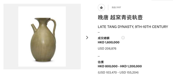 2016年6月香港佳士得拍出一件晚唐越窑青釉执壶,成交价为160万港币,可做参考。