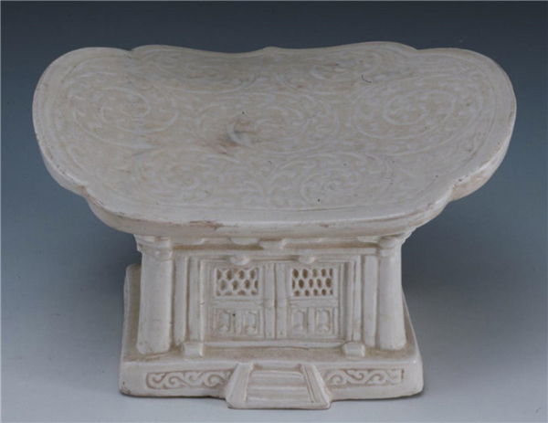 这件瓷枕通体施白釉,釉面滋润,聚釉处呈淡水绿色,玻璃质光很强,胎体细腻洁白。枕面作如意头形,其上刻满密而流畅的缠枝花卉纹,两侧微上翘,下承仿木结构建筑的宫殿形平座,门窗门拱、基址台阶均雕刻得形象逼真,殿宇前门紧闭,后门半开,一人侧立于门前,造型别致,独具匠心。