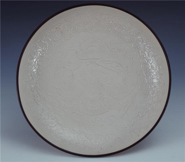 这类印花云龙纹盘的出土情况在陈万里先生的《调查平原、河北二省古代窑址报告》一文中提及。1948年河北涧磁村附近的“法兴寺”遗址,出土过这种印花龙纹盘十件,六件已流散到国外,其中有一件底部划刻“尚食局”三字铭文。可知这类器物是北宋或金代宫廷里的专用品。