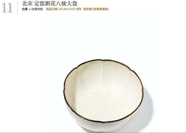 值得一提的是,虽然印花器是定窑的最著名品种,但目前定窑的拍卖纪录保持者是一只划花产品。2014年4月苏富比香港拍出了一件定窑划花八棱大碗,为日本著名古董商坂本五郎旧藏,成交价为146,840,000港元,为目前定窑产品中的最高价。