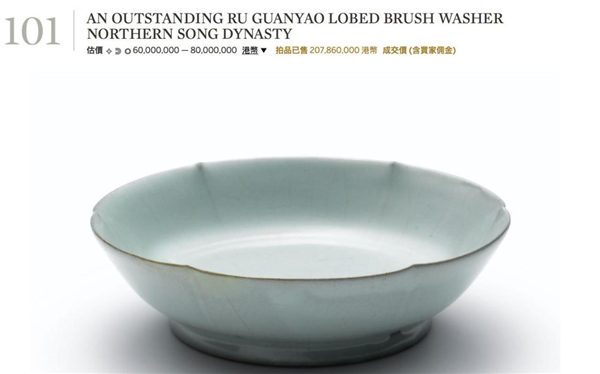 目前世界上已知的流传有序且藏于私人之手的汝窑共7件,最近现世露面的一件是2012年4月香港苏富比拍出的“北宋 汝窑天青釉葵花洗”,成交价为2.0786亿港币。它与大英博物馆所藏汝窑洗原为一对,同属克拉克夫妇的收藏,后辗转流入日本茧山龙泉堂,最后由苏富比拍出。