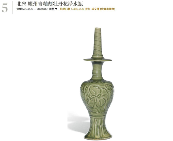 精品耀州窑同样在公开市场上出现的很少,多见的是盘碗类的品种。近年出现的精品有2016年4月香港苏富比的一件“北宋 耀州青釉刻牡丹花淨水瓶”,成交价为548万港元