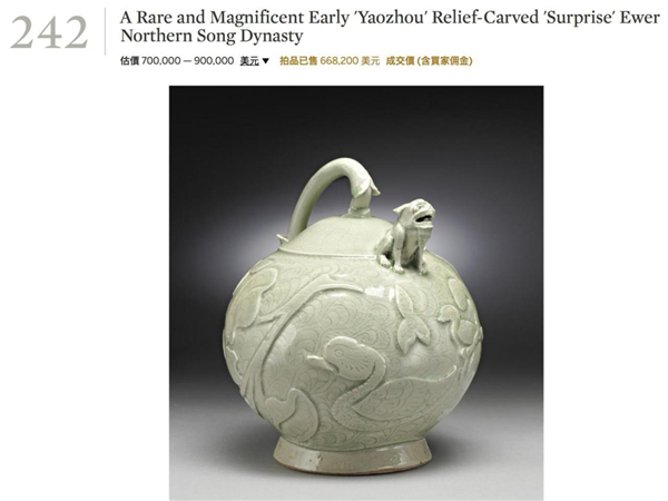 而耀州窑的历史拍卖纪录则要追溯到2007年9月纽约苏富比的一件倒流壶,成交价为66.82万美元,折合当时人民币为550多万元。