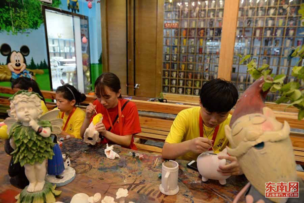7月6日,德化的顺美陶瓷生活馆迎来了50多位“中国寻根之旅”华裔青少年。他们兴趣盎然地在学习手拉坯制作,在陶瓷坯体上画画,在玩泥巴的过程中,体验瓷土带给他们的乐趣,感受陶瓷文化的魅力。图为华裔青少年在陶瓷上画画 据了解,此次的“中国寻根之旅”为期18天,参加的对象主要是葡萄牙华裔;之所以把德化作为此次活动的子项目,德化制瓷历史悠久,能让孩子们更直观地感受陶瓷文化源远流长。