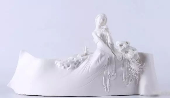 作品“颜如玉——暗香盈袖”以“书中自有颜如玉"为引子,用当代的雕塑手法塑造出婉约、小资的古代女子在对花独饮,大量留白的书卷给人无数的空间想像。德化白瓷自古以堆雕,捏塑闻名,特别是人物塑造工艺更具有特色,独有的白瓷材料,温润细腻很适合表现仕女如脂如玉的美感。