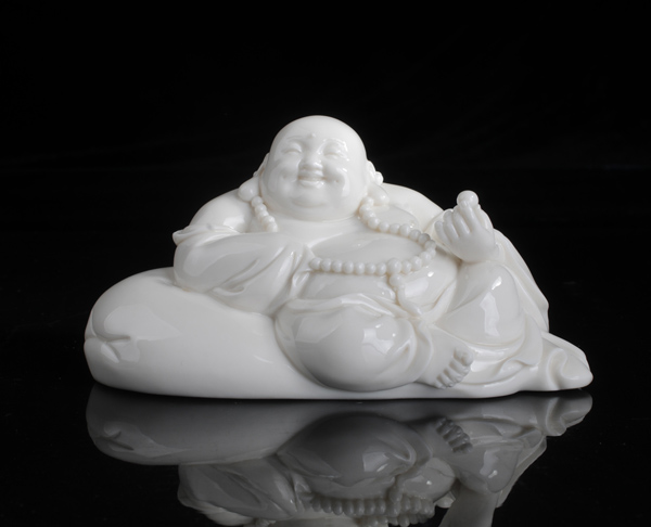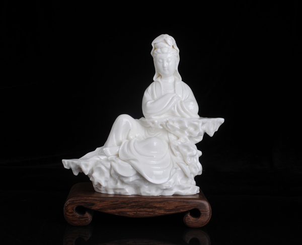 作品采用上等德化白瓷泥,经1300多度高温烧是,观音一改佛教造像直立或打坐的成规,无拘无束,自由自在。其姿态出色地突现了观音流畅的线条和优美的身段。
