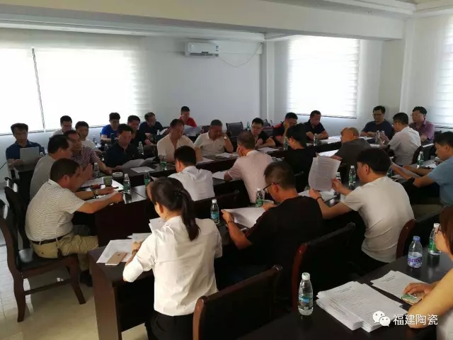 2017年8月16日,福建省陶瓷行业协会会长办公会在晋江磁灶镇政府会议室召开。省陶协会长陈建新、副会长吴声团、刘榕冰、吴国宽、林文智、张金钟、郭建洲、吴志伟、郑雄文、孙建兴等人参加会议。