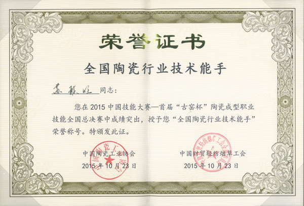 2015年荣获“全国陶瓷行业技术能手”荣誉称号
