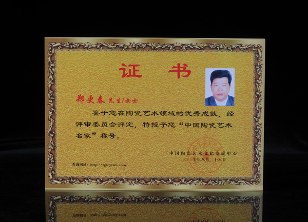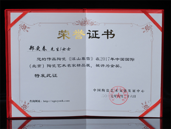 郑更春从事陶瓷绘画40多年,主要作品有山水彩绘、花 鸟、走兽等,作品多次获得国内各评比大赛金奖,如《招财 进宝》荣获2008年第十届中国名族民间工艺品、旅游纪念品 、礼品博览会金奖;《溪山暮雪》荣获2017年中国国际(北 京)陶瓷艺术名家精品展作品评比金奖等,其作品深受收藏 家及有识之士青睐,广受好评。