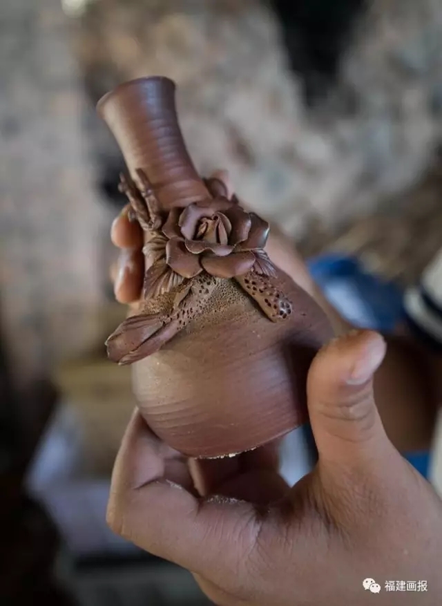 洞上陶艺村晓德陶艺坊的主人是“80后”陶艺师李德鹏,17岁初中毕业后,他进入朋友的陶瓷厂当雕塑学徒。之后为了谋生,他转行做起了铲车司机,中断了与陶瓷的缘分。直到三年前,看着三班镇陶瓷行业发展迅速,他毅然决定回到家乡与妻子开办了这间陶艺坊,重拾自己最擅长的手拉坯雕刻。经营陶艺坊一年多以来,李德鹏不仅提高了收入,也激发了创作灵感。