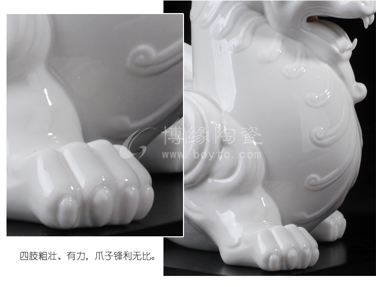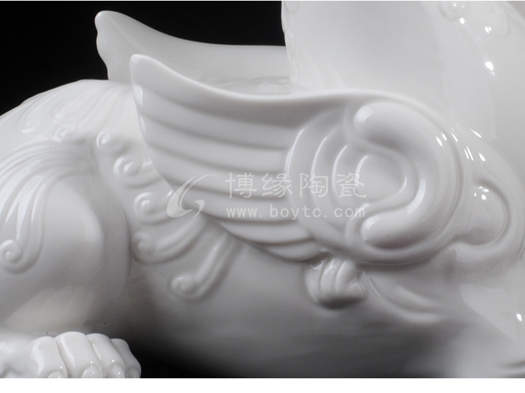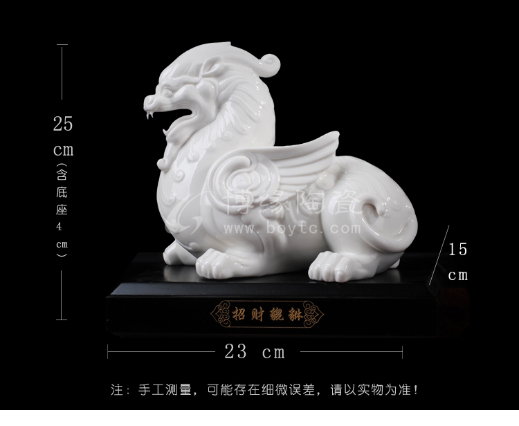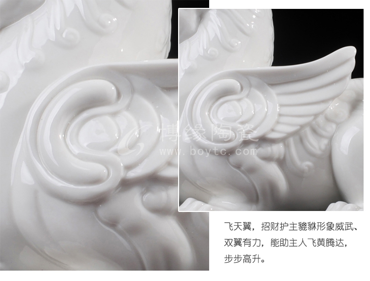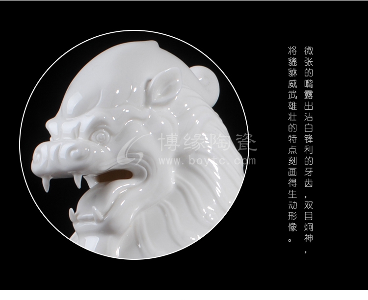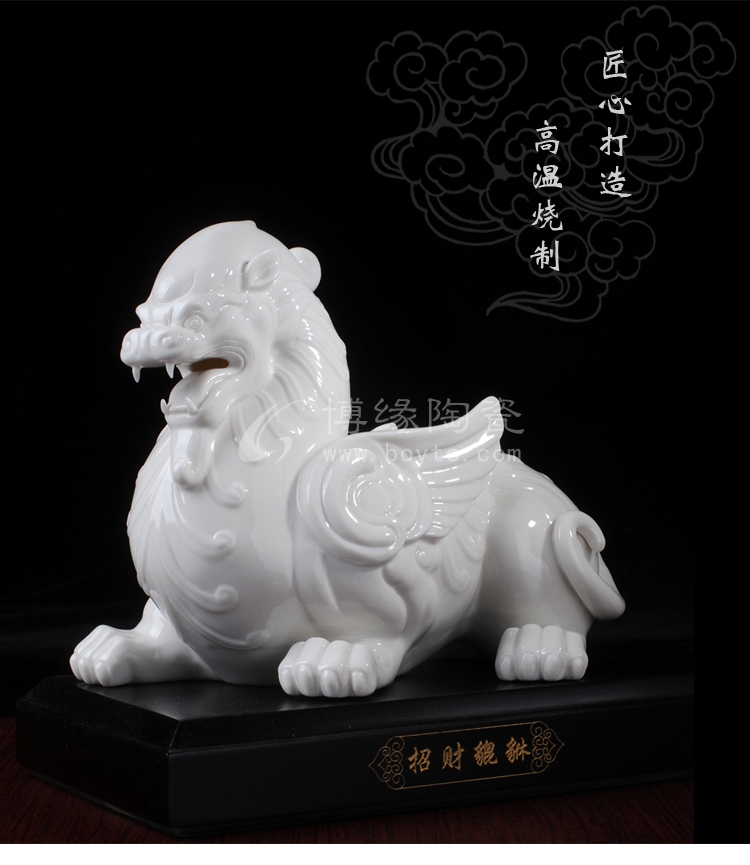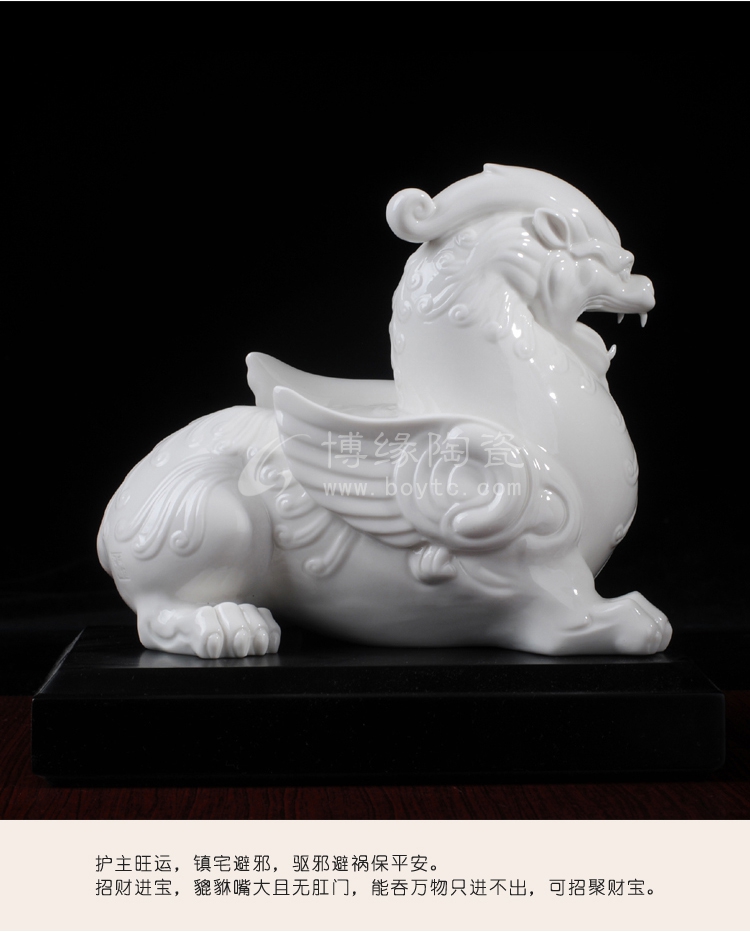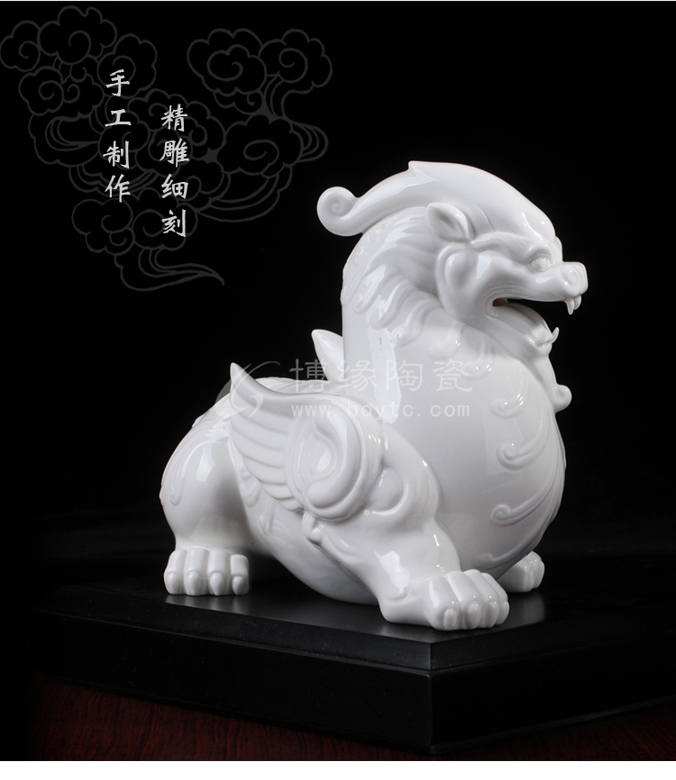 作品是由福建省陶瓷艺术大师亲手制作,貔貅霸气的外观、圆润的线条、造型独特、工艺清新且流畅,用上等等额高岭土制作而成,瓷质细腻、如脂如玉、晶莹剔透,令人爱不释手。