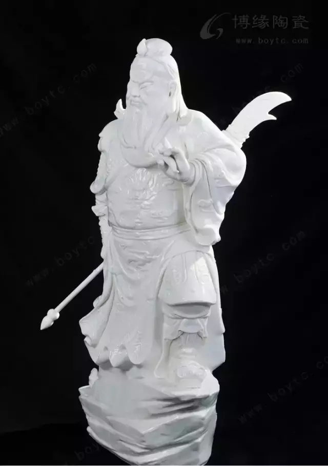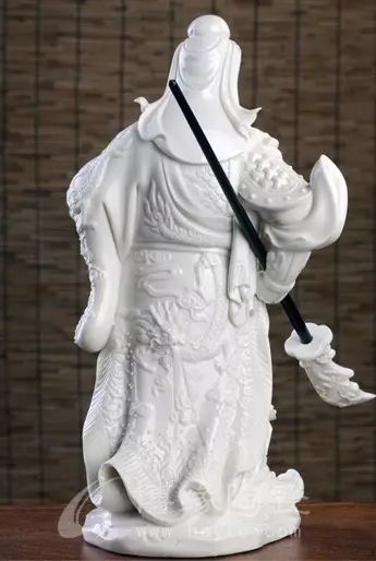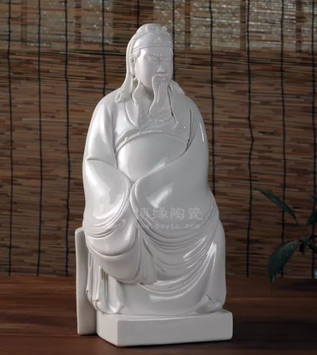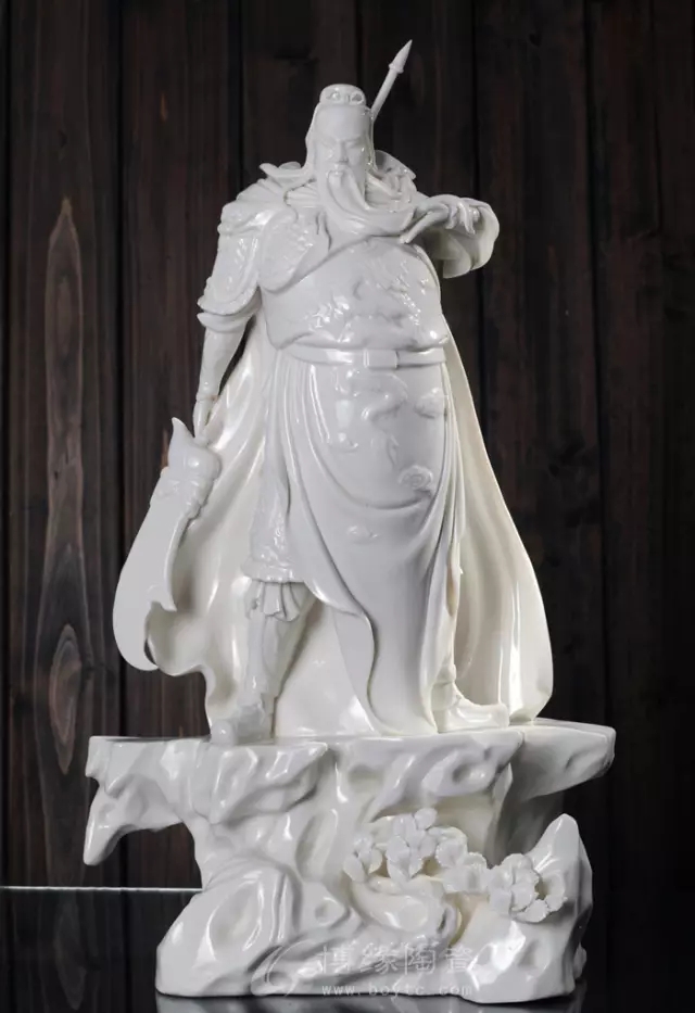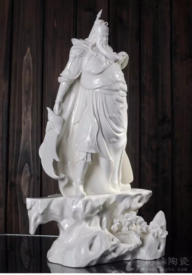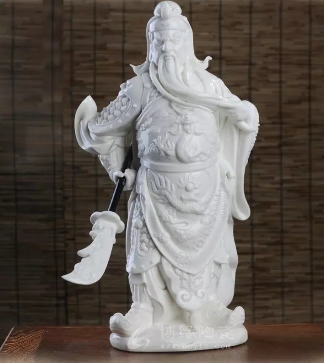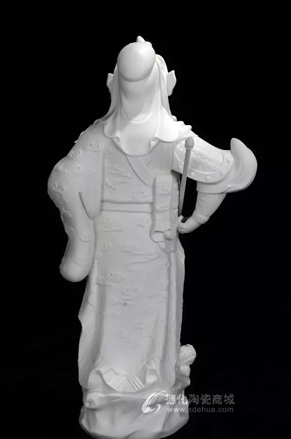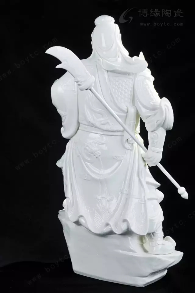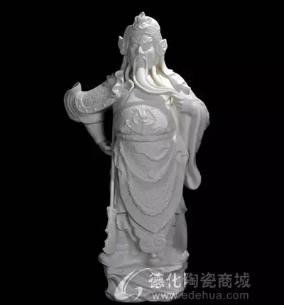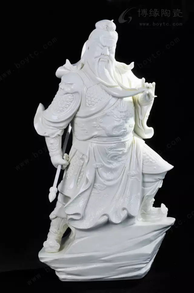 关公像是德化窑瓷塑艺术的常见题材之一。德化瓷塑在中国陶瓷史上久负盛名,它用优质的白瓷塑造神态各异的人物,以纯净莹润的釉色和生动传神的形象取胜,摒弃彩绘而追求单纯的雕塑美和原材料的质地美,独具艺术风韵。
