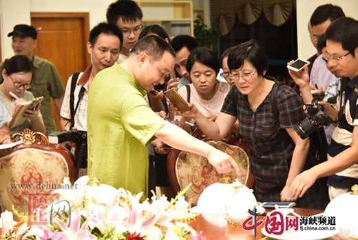 中国网泉州讯(记者 胡光华 文图)“哈!哈!哈!”9月14日,中国白陶瓷艺术馆艺术总监陈仁海一见到“异彩中国白”新闻采风团记者们前来,就紧紧握着中共德化县委常委、宣传部长陈坚宏的手乐不可支地开心大笑,笑得非常爽朗,他的笑声缘自该馆研发制作的118套《四海同心》系列国宴瓷,成功跻身成为金砖国家领导人厦门会晤国宴餐具。
