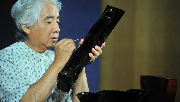 赤冢派传人漆艺大师三田村有纯现场展示漆器莳绘技艺。