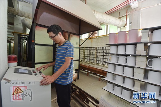 9月26日,在福建省泉州市德化县顺美陶瓷厂,工作人员在电热隧道窑前操控流水线。新华社记者 宋为伟摄