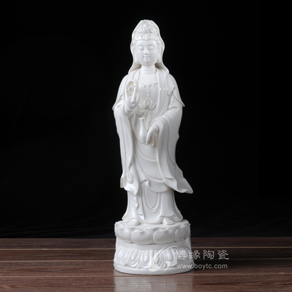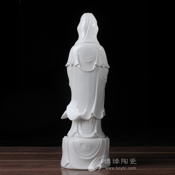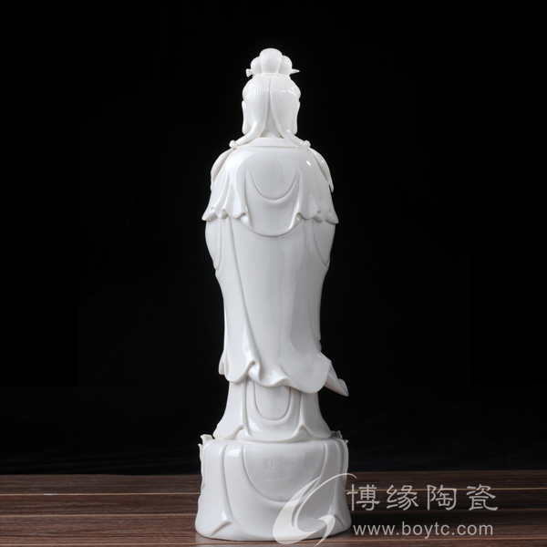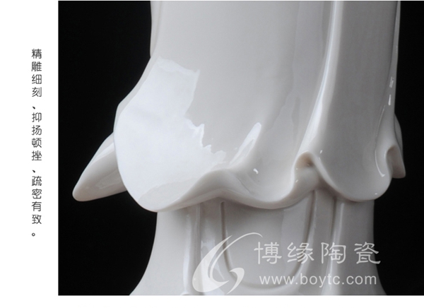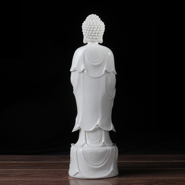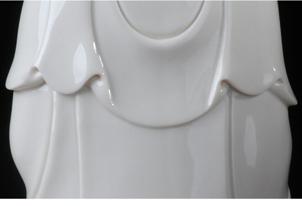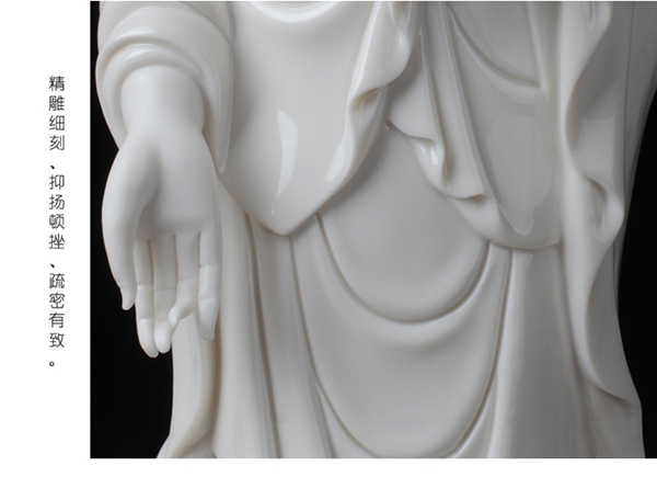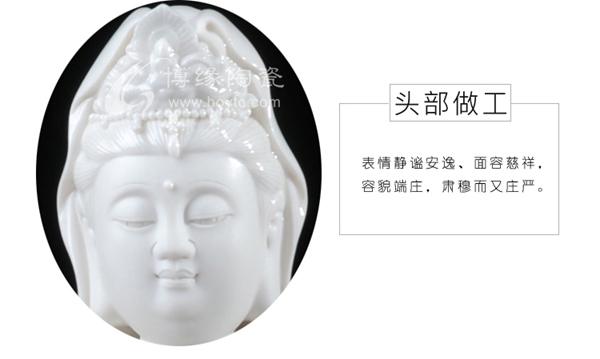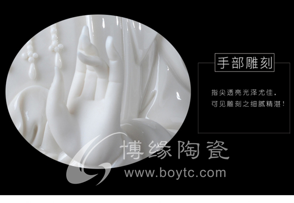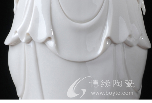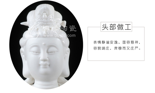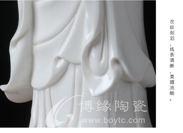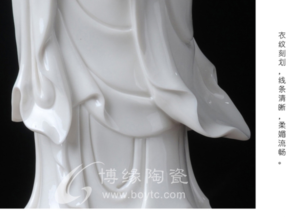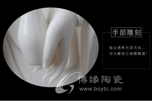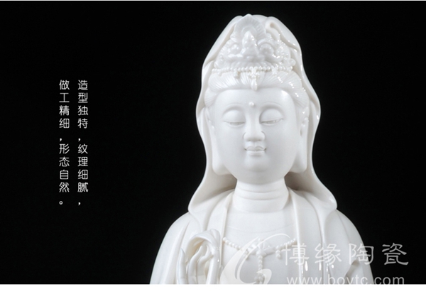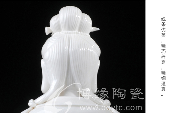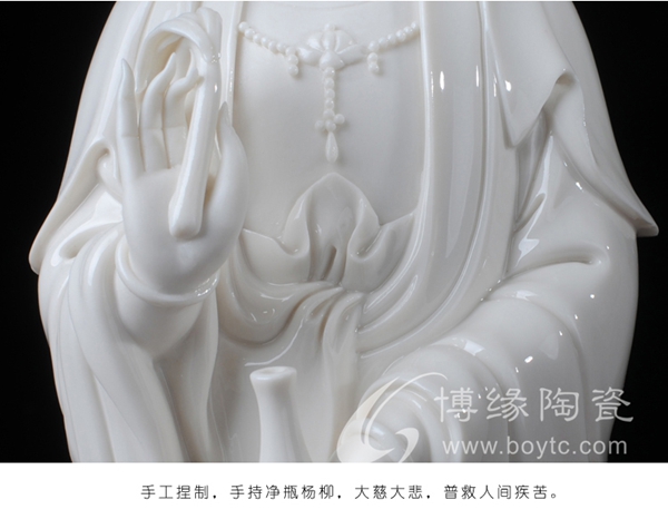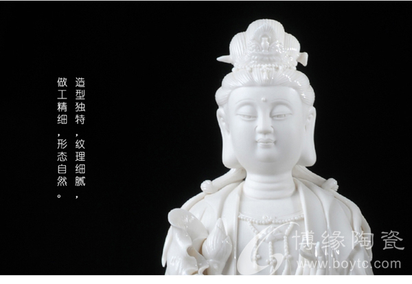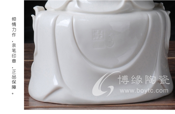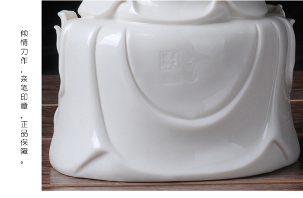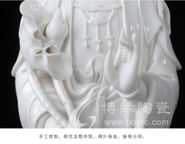 作品意境超然,纯手工捏制雕塑,灵动脱俗,佛像的项链珠串,凹凸有致,长袍衣纹无风自动,线条流畅灵动,尽显优雅,手部,指尖,纤细修长,透亮光泽,每个细节都是大师纯手工精心捏塑,技艺精湛。作品背部附有作者亲笔印章,具有很高的艺术性,鉴赏性和收藏价值。