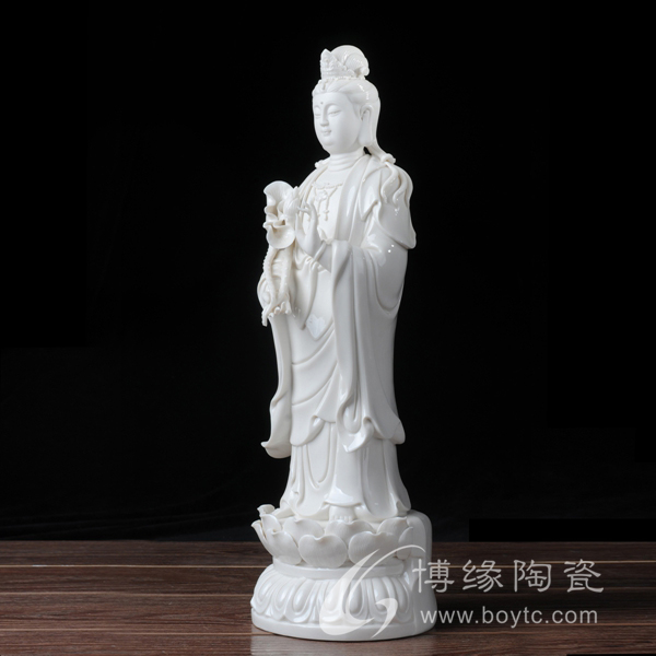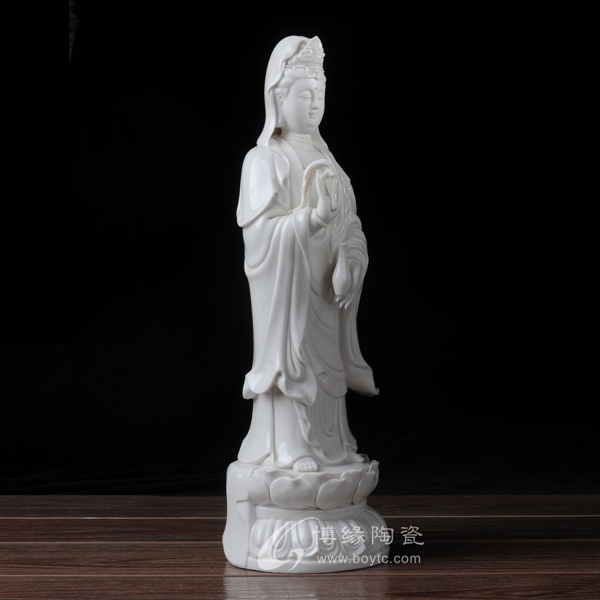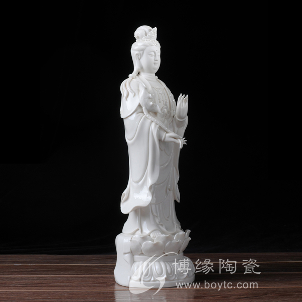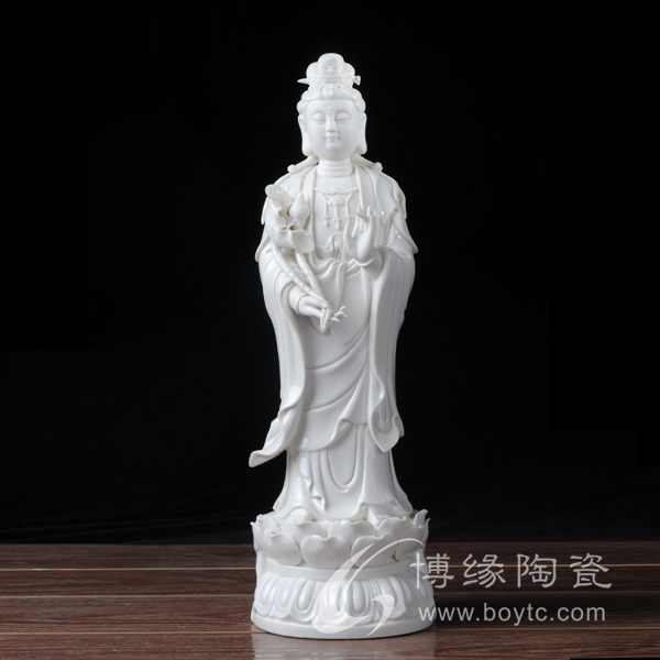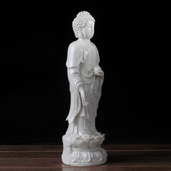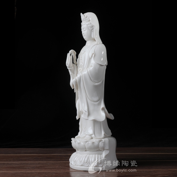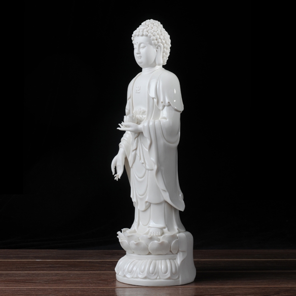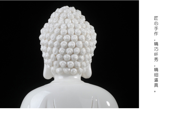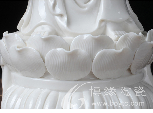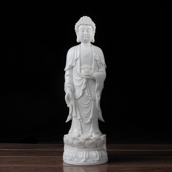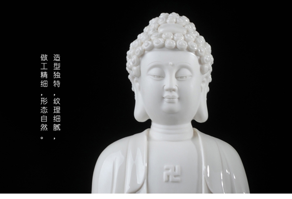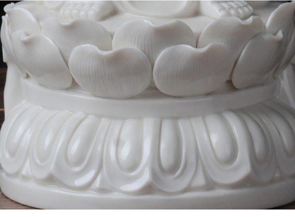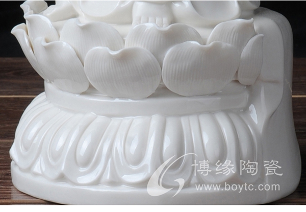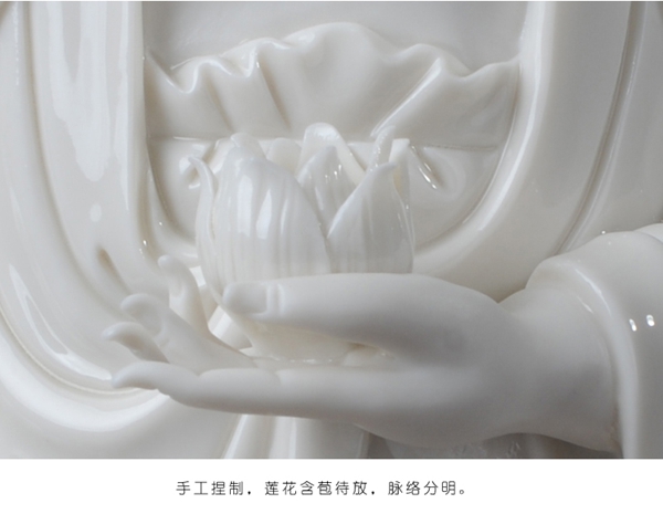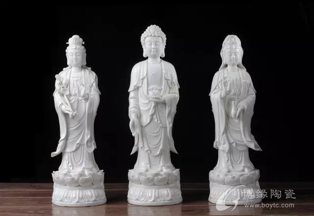作品西方三圣是以佛教净土宗崇奉的造像题材,选自优质白瓷作为塑像材质,这三尊像皆立于仰莲座上,各结不同手印显示各自不同的宗教功用和身份。佛像下的台座做成莲花造型,池中水波荡漾,尽显其大爱无疆。