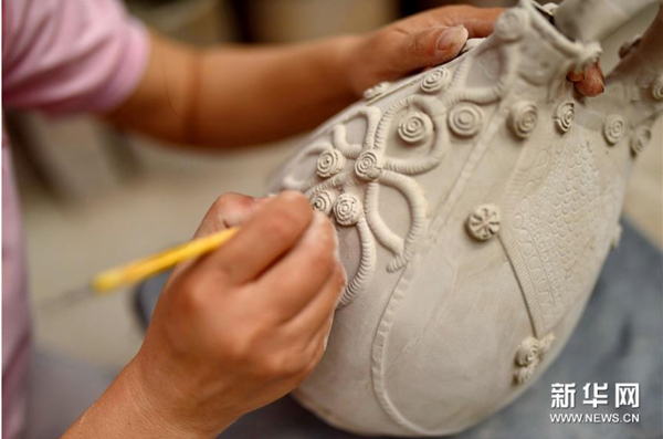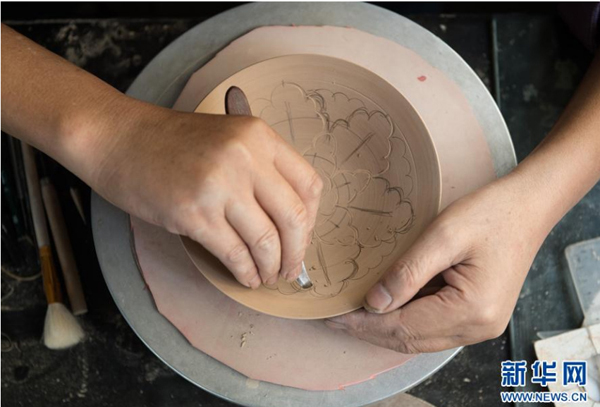 内丘县制瓷人员在邢白瓷坯体上刻花(2016年7月12日摄)。新华社记者 牟宇 摄