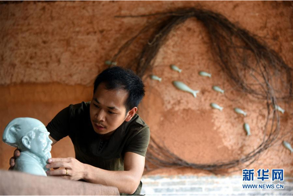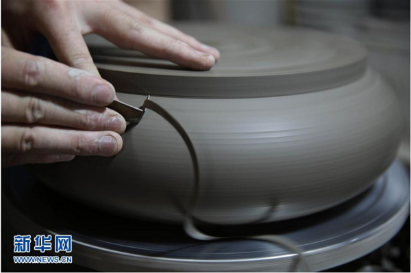 在河南省宝丰县一家汝瓷厂,汝瓷艺人在修坯(7月17日摄)。新华社发 何五昌 摄