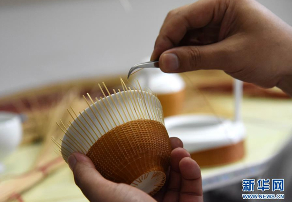 景德镇瓷胎竹编第五代传人张三石在进行瓷胎手工竹编(2017年6月26日摄)。 新华社记者 张瑞琪 摄