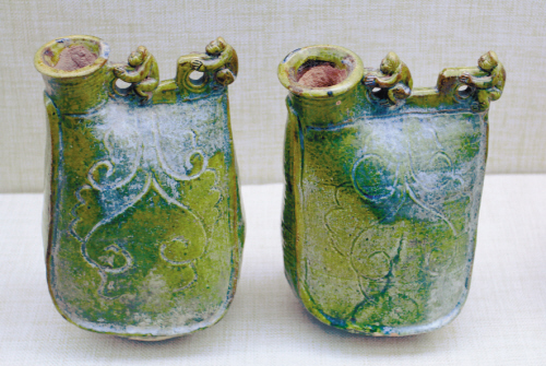 叶茂台辽瓷窑址先后出土的陶瓷制品近百件,有南方和河北烧制的影青、青瓷、定窑白瓷等,也有辽土烧制的白釉三彩瓶、米黄釉绿彩划花盆、印花梅瓶等。其中最有辽瓷特点的鸡冠壶也出土多件,如白釉环梁鸡冠壶、酱釉双孔带盖鸡冠壶等。