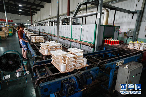 9月26日,在位于江苏南京的高淳陶瓷生产车间,工人在节能烤花电窑前整理瓷器。